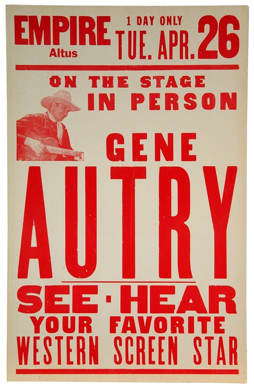Here Comes Santa Claus (Right Down Santa Claus Lane). The Singing Cowboy made it big in so many different ways. Film, radio, television, live theater and rodeo performances. He is the only entertainer to have five stars on Hollywood’s Walk of Fame, one for each of his aforementioned accomplishments. Poster (14 X 22”) is announcing Autry’s upcoming appearance in 1960 at the Empire Altus theater. Get Back in the Saddle Again and ride into the sunset with Autry. Condition is EX.