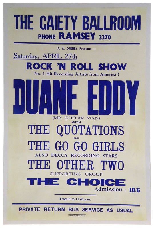 John Fogerty said, “Duane Eddy was the front guy, the first rock & roll guitar god.” Eddy is an American guitarist best known for his twangy guitar style and Billboard Magazine named him the number one rock and roll instrumentalist of all time. In the 50’s and 60’s he churned out 24 hits. “Rebel Rouser” was the one that propelled him to the forefront of the music world and his “Peter Gunn” remains a radio staple to this day. In June 2004, he was presented with Guitar Player Magazine’s “Legend” Award. The only one to receive it before him was Les Paul. Poster (20 X 30”) offered here is from Eddy’s performance at the Gaiety Ballroom in Wales, circa mid-60’s. One of the other acts on the bill is “The Other Two” that consisted of two British women, one of whom married Mr. Eddy.