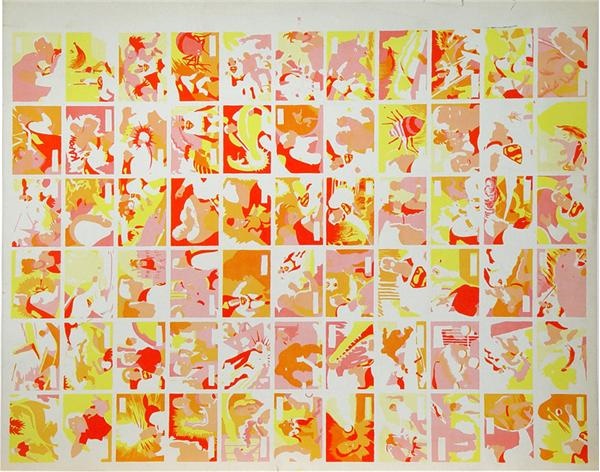 Look. Up in the sky. It’s an incomplete series of drawings of Superman. Actually, it’s not an incomplete anything. It’s a part of the process of creating the 1968 Topps set of Superman cards. Before they become cards they are laid out in unfinished form. This 23 X 28-1/2” sheet is part of the color printing process. The uncut sheet eventually takes its final form and then each card is individually cut before it ends up in the pack that you buy. 66 cards adorn this sheet. The finished set is also available in this auction. Great item for you Superman and card collectors.