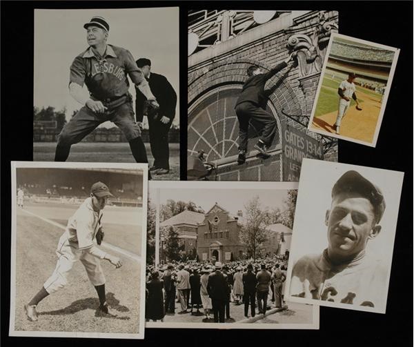 This great collection of 25 photographs has something for just about every fan of baseball folklore. Among the treasures in display: A shot of boys playing baseball on Manhattan’s Lower East Side in 1947 by noted New York photographer Morris Huberland, a rare 8 x 10” of Ronald Reagan as pitcher Grover Cleveland Alexander in “The Winning Team,” photos from the collection of Hall of Famer Max Carey including the 1923-24 Pittsburgh Pirates Glee Club, a Pirates 1922 team photo with Carey, Chief Yellowhorse, Pie Traynor, Rabbit Maranville, Pirate players clowning with Maranville in a wheelbarrow, Carey and an umpire, a great shot of Ralph Kiner in his Pirate years, Ted Williams leaping in the outfield in a killer shot, from Culver Service, an awesome shot of Cincinnati Reds manager Bill McKechnie, a 1960s Kodak color snapshot of Willie Mays at Dodger Stadium, an exceptional Paul Dean wire photo, a 1929 Kiki Cuyler shot from Culver, a shot of Luke Appling from 1934, Johnny Neun by Charles Conlon from the Baseball Magazine archive with Conlon’s handwriting on the reverse side, a rare 1931 photo postcard of the Chicago Cubs when they held spring training on Catalina Island off the coast of Los Angeles addressed to Ray Schalk, the 1939 dedication of the Baseball Hall of Fame in Cooperstown, excellent group fans shots including one of Ebbets Field fans waiting for World Series tickets and another of a young fan trying to scale a wall to get into the Brooklyn ballpark and shots of Hall of Fame pitcher Bob Feller in uniform and shirtless, displaying the well-developed shoulder muscles that propelled his 100 mph fastball. The average picture size is 6 x 8” and overall the collection is EX.