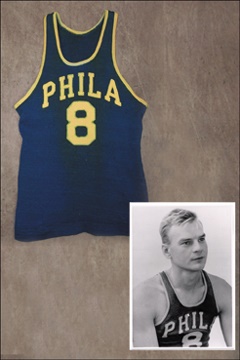 The team is perhaps best remembered as the one with which Wilt Chamberlain scored 100 points in a single game, but a decade and a half before that the team made history by winning the franchise's first World Championship. This gorgeous home jersey was acquired from a player on that team, Mr. George Senesky, a young guard pivotal in the Warriors' Championship bid. Impossibly uncomfortable wool jersey has "Phila" across chest and Senesky's number "8" on front and back. Great wear evident, but jersey is damage free and displays perfectly. Included with lot is photo of Senesky wearing this very jersey back in that glorious season.