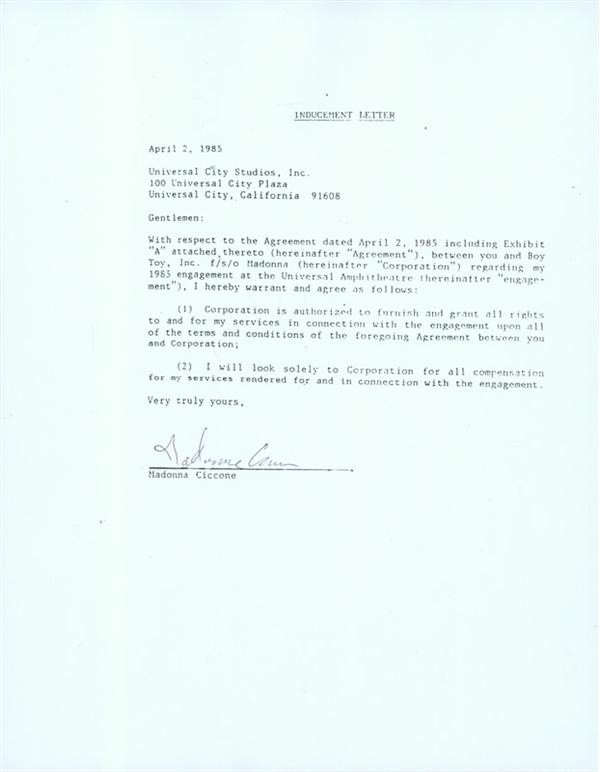 At first, her initial album sold at a lukewarm pace but then a fledgling network called MTV put her sexy videos in heavy rotation. It made her an almost instant star and made her the clothing and style model for practically every young teenaged girl in America. You couldn’t walk through a mall without running into a few hundred “Madonnas.” Eventually she became the most successful female artist of all time. Mini Madonna collection with a signed Screen Actors Guild Card, contract and personal check. The card is from 1989 and shows her social security number, and is signed “Madonna” on the back.. It has been torn and repaired with tape. The one page contract, signed “Madonna Ciccone,” is an “Inducement Letter” from Madonna to Universal City Studios in regards to a previous agreement concerning her 1985 engagement at the Universal Amphitheatre (NRMT). The personal check from 1987 is for $75 for a massage (NRMT). The SAG card is signed Madonna but the other two are signed using her real name, Madonna Ciccone. Great material from the Material Girl.