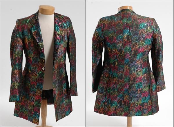 We have as colorful a jacket as we guarantee you have ever seen. Nope, It’s not from “Joseph And The Amazing Technicolor Dreamcoat.” It’s from the guitarist that all other guitarists wish they could be. Jeff Beck (a great guitar man in his own right) perhaps said it best when he told of seeing Hendrix in concert and then putting away his axe and refusing to play for an extended period of time. The reason was that he felt that he could never come close to what Hendrix could do. If you’re a Hendrix fan or just an appreciator of greatness you won’t be able to pass this one up. It’s a very multi-colored shiny suit jacket that Jimi actually wore. Five white buttons down the center, against a psychedelic background and in NRMT condition. The blue lined medium sized jacket has its original tag “Made in England Boutique Design Centre scott lester London” on the inside right, just below a pocket that has a thin piece of material matching the front running along its edge. If you acquire this jacket you still won’t be able to play Jimi’s memorable Star Spangled Banner but you will be easily seen if you’re in Crosstown Traffic with a Foxey Lady or two in your company.
