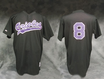 Unless your last name is Rockefeller, a game worn Ripken jersey is probably going to be a bit out of your price range. But we've got the solution. Black mesh batting practice jersey was worn pre-game by the game's sturdiest star. "Orioles" sweeps chest in orange and white; all-important number "8" on verso. "Majestic, Diamond Collection [size] 46" tagging in tail. Fine use on this guaranteed Hall of Famer's jersey.