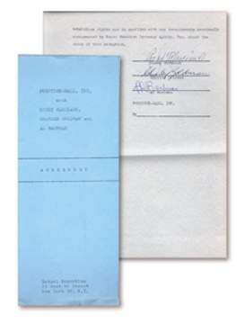 Wonderful and elaborate document for the Prentice-Hall tome by Rocky Marciano with Charlie Goldman and Al Bachman. Entitled, Bodybuilding & Boxing, it is dated from 1957. Nine pages in length and signed on the final signatory page by Rocky Marciano, his famed manager Charlie Goldman and Al Bachman in Mint fountain pen ink. Measures 14.5x9".