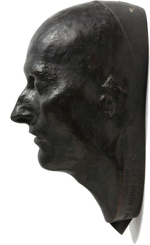 The finest piece in The Weiner Collection. There are other versions of this mask, however, this one is the ultimate. Bronze sculpture measures 13x5x7.5”. Engraved on both sides of the base is the mark of the bronze maker, “Fondu Par L. Richard Ft Quesnel A Paris...Dr. F. Antommarchi.” At the bottom, is a raised medallion with the image of Napoleon. It reads, "Napoleon Emp Et Roi Souscription Dr Antommarchi 1833". Dr. Francesco Antommarchi served as the deposed emperor's personal physician and constant companion during the last two years of Napoleon's life. Some believe it was the surgeon Francis Burton of Britain's Sixty-Sixth Regiment at St. Helena who made the so called "parent mold". Regardless, the beauty of this piece is unparalleled. And the irony is there is no other Napoleonic piece extant that brings the Emperor more to life than this. Note: The lot comes with a copy of the book The Story of the Napoleon’s Death Mask by G.L. De St. Watson (1915). This is the British 1st edition limited to 500 copies.
