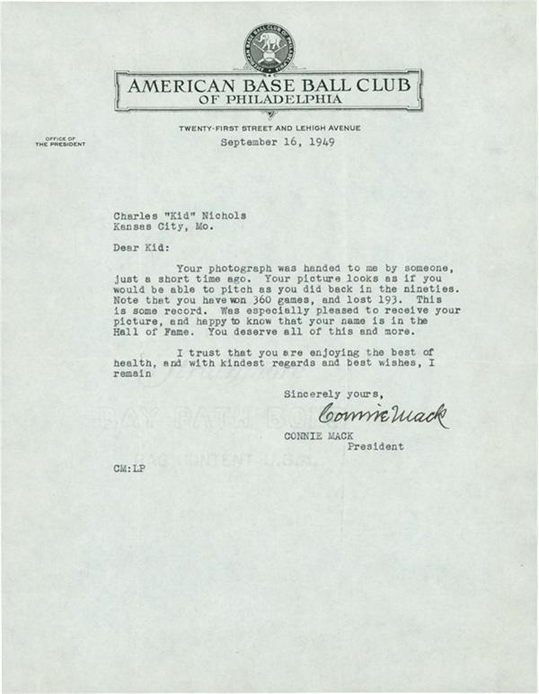 Lot # 292: Connie Mack Hall of Fame Congratulatory Letter with 360 Wins Content To Kid Nichols
