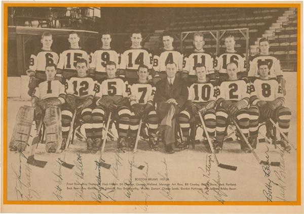 Sepia toned print of 15 team members including Eddie Shore, Bill Cowley, Tiny Thompson, Milt Schmidt, Flash Hollett, Dit Clapper, Cooney Weiland, Woody Dumart, Bobby Bauer and manager Art Ross. Borders have been slightly trimmed, but appears NRMT. Signatures average 8/10. This piece originally comes from the Eddie Shore estate.