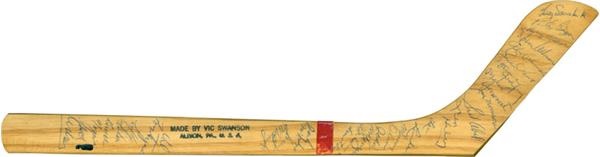 In 1959-60 the Detroit Red Wings lost to Toronto in the first round of the playoffs despite some great players on the roster. The legendary Gordie Howe captured the Hart Trophy as MVP despite his team's mediocre record and Terry Sawchuk also performed admirably. This mini-stick (14-1/2" long and 1-1/4" wide at the blade) is a real beauty with signatures that average 9/10. Terry Sawchuk is perfect at the very tip of the blade. Ullman, Delvecchio, Howe, Pronovost and Abel, are all here. Bruce Norris and Jack Adams have also signed along with "Gordon Howe" again on the verso. Stick itself is EX-MT.