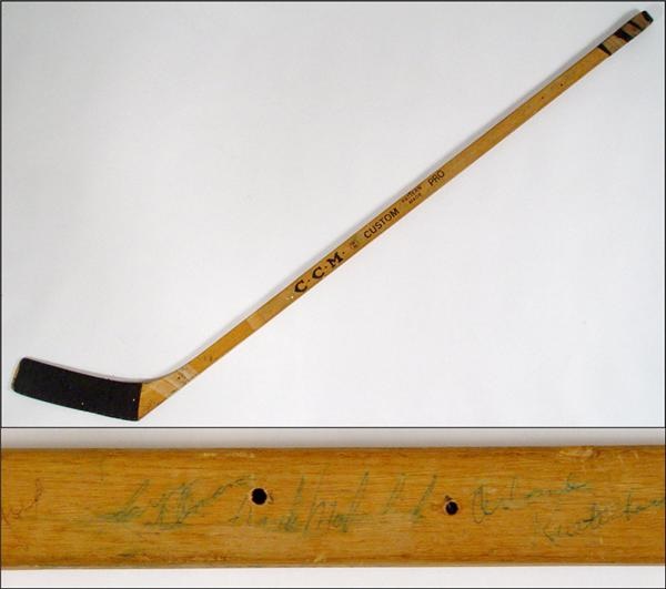 CCM stick belonged to this Hall of Famer has all original tape and shows good use. "Stanley" and #26 stamped on shaft. 15 signatures in ball-point, including Sawchuk, Horton, Mahovlich, Pulford, Pronovost and Ellis. Autographs are generally 6's & 7's. Three mounting holes.