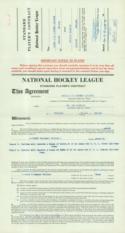 The 1951 Stanley Cup Finals pitted The Toronto Maple Leafs against their arch rivals, the Canadiens. In search of their third Cup in a row (true Hat Trick), the Leafs took a three games to one lead into game 5. All the previous games went to overtime and this was to be no different. At 2:59 of the first overtime period, hard hitting, low scoring young defenseman Bill Barilko took a pass at the point from Howie Meeker and uncharacteristically darted toward the net lifting a wrist shot over Gerry McNeil's right shoulder. In the process, he was hit by a Hab defender and went airborne to beat Bobby Orr to a dramatic "Flying Goal". Game over, the Leafs win the '51 Cup, but tragedy loomed just a few months later as Bill Barilko was lost in a plane crash. His remains were not found until 1962, ironically, the next year the Leafs won the Cup. His young career dashed after only four years, we present his Leafs contract from that 1949-50 season. In pristine condition, this official NHL contract bears the signatures of Bashin' Bill and Conn Smythe, the Leafs' President. His pay for that season was $8,000. Comes with Mission Cap card depicting this historic goal. Original 6 hockey lore at it's finest.