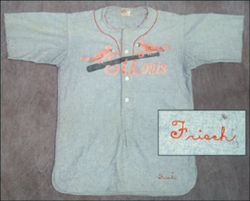 One of the finer flannels to come down the pike. Beautiful specimen of a Cardinals jersey from this man who made St. Louis--forget Rogers Hornsby. Grey road with the wondrous "Cardinals" perched on a bat across the front. It is all fully embroidered and has toned down to a nice bright pink. Braided trim winds its way through the placket. It is a midi button front with three original white ivories. Tagged in the collar with the early red Rawlings tag in cloth. Best of all it has been written in ink "Frisch" with a size "40" and his uniform number "4." The sleeves have been adapted, as you would need baboon arms to work with these if not cut. The all-important "Frisch" in red embroidery in the tail is supremely elegant. The number "4" has been removed from the verso. Comes with a pair of flannel pants from a slightly later era.