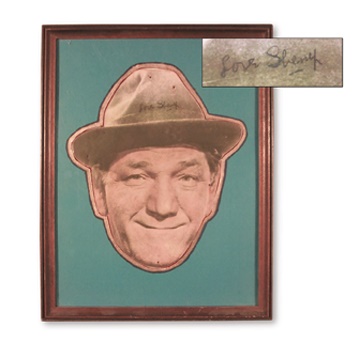 Real photo on cardboard head of this fabulous Stooge dates from the 1940's. Head is magnificent 12 x10" and it is signed on his hat "Love, Shemp" in blue ink. Used for a performance where it was then signed. Beautifully framed with die-cut matting. Couple of pin holes o/w EX. Consigned by the gentleman who owned it for twenty-five years.