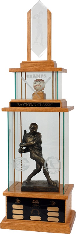 The Baytown Classic Championship Trophy may or may not be a real trophy that may or may not go to the winner of the annual exhibition game between the St. Louis Cardinals and Cincinnati Reds that may or may not be played. Cardinals and Reds logo are etched in glass. Only one plaque on bottom base is engraved "1988 Cincinnati Reds." The rest are still blank. This probably means that the game was only played once and then discontinued. Either that or it is a mock up for a trophy that exists only in someone's mind. One of the largest (and heaviest) and most mysterious of the modern day baseball trophies that we have seen. Huge trophy was purchased right from the St. Louis Cardinals. Stands 51" high, 15-3/4" wide at the base and is 11-1/4" deep. Contains a 16" statue of an unknown baseball player that is made of something and sculpted by someone. On the level above the unknown statue is an official NL ball (Giamatti). On the next level up is a piece of etched glass (12-3/4" tall) of a player throwing a ball. A must have for all fans of events and trophies that may or may not exist.