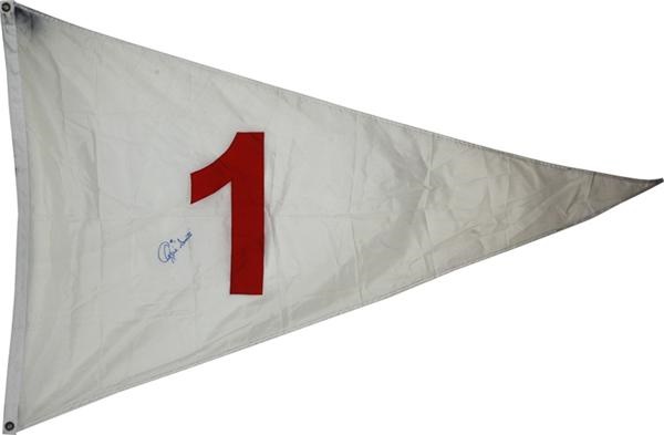The Wizard's blazing red number "1" is sewn to this giant white nylon flag that comes directly from the St. Louis organization. Signed by Ozzie in black sharpie (8/10), it is one of several flags that hung above Busch Stadium during their final season of 2005 in their retired numbers section. Screened with manufacturer's name, "The Flag Loft" along the flag's base on the reverse. Measures 48" at base, 70" in length, light soiling along edge where banner came in contact with the pole, EX-MT.