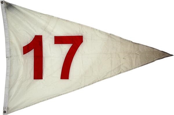 He was the most recognizable and by far the most talented player from the famed "Gas House Gang" whose abilities on the field and antics away from it granted him a place in American folklore. Offered is one of several flags, though by far one of the more significant, that hung in the retired numbers section of Busch Stadium during the final 2005 season. Dizzy Dean's number "17" is sewn on both sides of the flag in Cardinal red nylon against a white banner of the same make. Screened with manufacturer's logo above the lower grommet, "The Flag Loft", and written with "17" in blue sharpie. Measures 48" at base, 70" in length, light soiling along edge where banner came in contact with the pole, EX-MT