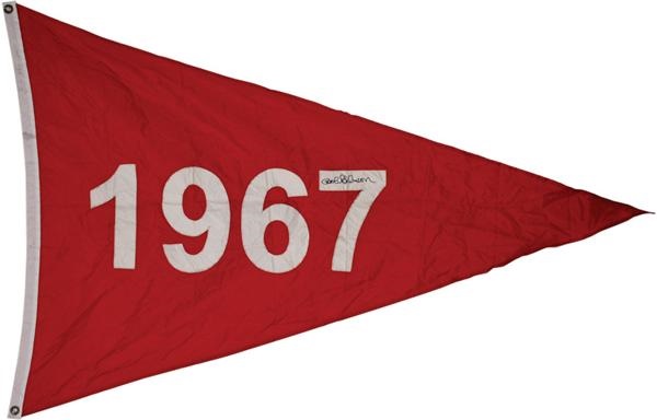 St. Louis' sensational seven game World Series victory over Boston was the inspiration behind this stunning red and white nylon offering. One of several flags that hung above Busch Stadium during their final season of 2005, it is sewn with "1967". The "7" is signed by Cards pitching ace Bob Gibson in black sharpie that grades an "8" out of possible "10". "Hoot" was the series hero and MVP after putting on a trio of flawless pitching performances and even blasting a homer of his own in the deciding Game 7. Measures 48" at base, 70" in length, light soiling along edge where banner came in contact with the pole, EX-MT
