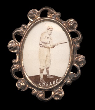 He appears to be wearing a Red Sox uniform in the tiny image on this delicate pin's face, which would date this one no later than 1915. It is also the same issue as the Frank Chance pin in this auction, and Chance's playing days ended in 1914. EX. 1x1.5". Real photo.