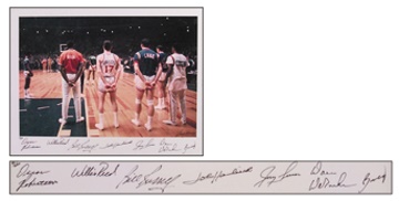 Limited edition (22/250) photo pictures some of the true giants of the game. Seven of them have signed at the bottom white border in perfect black sharpie. From left to right: Robertson, Reed, Russell, Havlicek, Lucas, DeBusscher and Barnett. Expertly matted and framed with descriptive brass plaque at bottom.