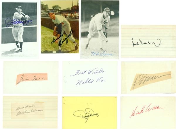 Gigantic offering of over 5,000 baseball autographs, mainly on 3 x 5" cards and GPCs. The signatures span the 1930's to the 1980's, with a large number dating to the 1970's. Over 700 are St. Louis Cardinals related, as the collector that owned this vast collection is a huge fan of the Redbirds. Hall of Famers in the 3 x 5"/GPC group: Aaron, Alston, Aparicio, Appling (3), Ashburn, Averill (3), Baker (check cut), Bancroft, Banks, Bell, Bench, Berra (2), Boudreau (3), Bunning, Carey, Cepeda, Chandler, Chylak (staple mark), Clarke (pencil cut), Cochrane (ink cut), Combs, Conlon, Coveleski (2), Cronin, Dean, Dickey, DiMaggio (affected by stamp), Doerr, Doby, Drysdale, Durocher, Eckersley, Faber, Feller, Ferrell, Fingers, Fisk, Flick, Ford, Fox, Foxx (ink cut), Frick, Frisch, Gehringer (2), Gibson, Gomez (2), Greenberg (2), Grimes, Grove (3), Gwynn, Hafey, Haines (2), Harris, Hartnett, Herman, Hooper, Hoyt (2), Hubbell (2), Irvin, T.Jackson, Jenkins, J.Johnson (2), Kaline, Kell, Kelly, Killebrew, Kiner, Koufax, Lasorda, Lemon, Leonard (2), Lindstrom (2), Lombardi, Lopez (2), Lyons, Manush, Marichal, Marquard, Mathews, Mazeroski, MacPhail, McCarthy, Medwick, Mize, Molitor, Murray, Musial, Newhouser, Niekro, Paige (2), Perry, Reese (2), Rice (2), Rizzuto (2), Roberts (2), B.Robinson (2), Roush (2), Ruffing, Ryan, Sandberg, Schalk, Schoendienst, Sewell (2), Sisler, Slaughter, Snider (3), Spahn (3), Stengel, Terry (2), L.Waner, P.Waner (pencil cut), Weaver, Wilhelm, Wynn and Yount. More Hall of Fame autographs including picture postcards and yellow HOF plaques: Aaron, Alston, Appling, Averill (2), Bell, Boudreau, Conlon, Coveleski, DiMaggio, Drysdale, Grimes, Irvin, Kaline, Kelly (2), Killebrew, Kiner (2), Koufax, Lemon, Lopez (2), Lyons, Marichal, Mays, McCovey, Mize and Slaughter. Some of the the non-Hall of Famers here: Roger Maris (1978 GPC), Dawson, Kluszewski, Howard, DeBusshere, Furillo, McSherry, V. DiMaggio, Halas, Nevers, Boyer, Pinson, Quisenberry and Wambsganss. A high percentage of the signatures are from players that never made it too big, but there are many All-Stars sprinkled in. Most were obtained in their first few seasons in the bigs. Overall condition of the lot is Excellent. This will keep you busy for months.