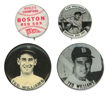 NRMT quartet remembers the good times in Beantown, though not 100% accurately. "World Champions, Boston Red Sox, 1946" button (1.25" diam.) was obviously printed before the Cardinals won Game Seven that year. Three Williams pins picture The Kid in sharp black and white. Two are 1.75" diam.; the third is 1.25" diam. All four are NRMT.