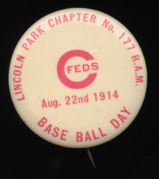 Federal League memorabilia ranks among the scarcest in the realm of baseball collectibles. The short-lived rival to the American and National Leagues remains one of the most fascinating sidenotes of our national game. Souvenir pin was produced by a Lincoln Park lodge in support of the "Chicago Feds' Base Ball Day" on August 22, 1914. Exceptionally strong appearance, EX-MT.