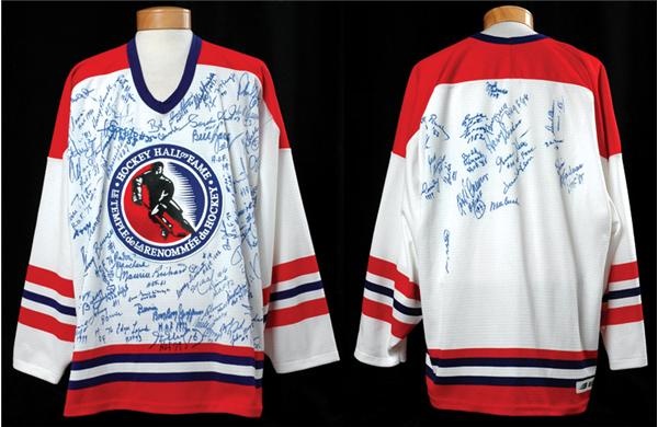 Imagine, over 80 Hockey Hall of Famers signing one jersey. You don't have to imagine it because it's real. Jersey signed all over the front with some on the back. All signatures are in blue Sharpie, a good deal of them with uniform numbers or year of induction, with most being NRMT or better. Jersey is white with red and blue trim. "Bauer XL" tag in collar Signatures include: Espo, Beliveau, Keon, Sinden, Pilote, Giacomin, Mullen, T. Esposito, Bower, Rocket Richard, Hull, Howe, Worsley, Geoffrion, Dionne, Hall, Bucyk, Orr, Gadsby, Lindsay, Dryden, Gilbert, Schmidt, Lemieux, Bossy, Mikita, and Clarke. This piece was signed at a Hall Of Fame functions in Toronto. To get all of these signatures in one place, in one time again, would be near impossible.