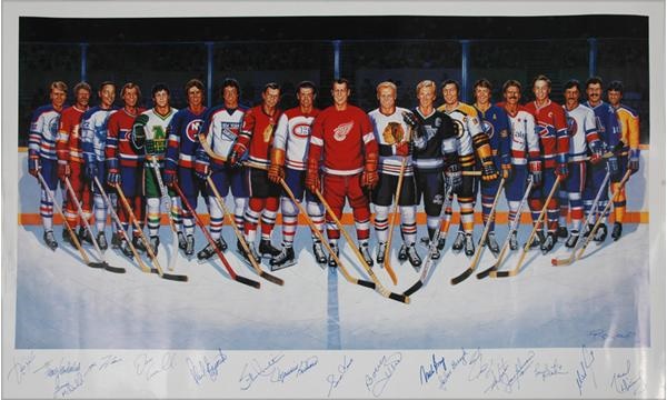 All sports have their own special exclusive clubs where only the elite may gain entrance. In NHL hockey, one of the most prestigious clubs is filled by the few that reached the plateau of 500 career goals. Check out this lineup: Kurri, McDonald, Mahovlich, Lafleur, Ciccarelli, Bossy, Espo, Mikita, Richard, Howe, Hull, Gretzky, Bucyk, Perreault, Gartner, Beliveau, Trottier, Goulet and Dionne. One of the nicest that you will find. It is one of the original 1000 and is #128. Signed by all but Gretzky in NRMT-MT blue Sharpie. Also signed by the artist, Ron Lewis. Print (37-1/4 x 22-3/4") itself is Near Mint.
