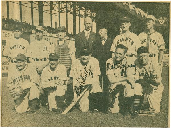 Dating to the early 1940's, this newsprint photo includes twelve baseball immortals, including Babe Ruth and Walter Johnson, who have boldly signed the photo. Others pictured include Eddie Collins, Connie Mack, Honus Wagner, Tris Speaker, all gathered at the Polo Grounds for a War-time benefit. The 7" x 5 3/8" photo is in EX condition, with strong autographs rating 8/10, and a caption affixed to the reverse. A fine pairing of the Babe and the Big Train.