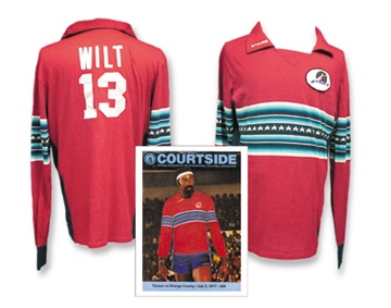 It's a well-known fact that The Stilt entered the world of professional volleyball when his basketball days were done, using his enormous height to spike the opposition into submission. Super-long sleeved Los Angeles Stars jersey shows fine use, with "Wilt 13" on back. Almost identical to the jersey he wears on the cover of a 1977 volleyball game program. Another volleyball magazine with the famous coverboy is included. All come from the Chamberlain estate.
