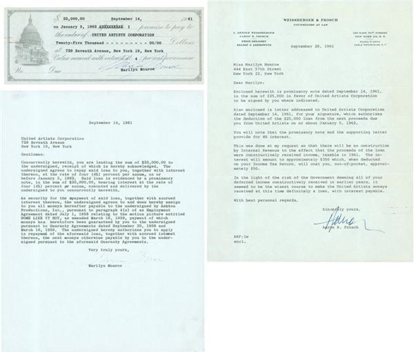 Incredible correspondence between Marilyn and United Artists Corporation memorializing a loan of $25,000.00 to Marilyn. Includes (1) the original Promissory Note signed by Marilyn in blue ballpoint (9/10); (2) photocopy of the Loan Agreement signed by Marilyn, especially noteworthy because in it, she pledged as security for the loan all proceeds due her from the film "Some Like It Hot"; and (3) an original signed letter to Marilyn from her lawyer regarding the loan and its tax consequences. A rare and intimate glimpse into the business dealings of an American icon.