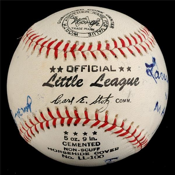 A baseball that gives you options. You can display it as a single signed Napoleon Lajoie ball if you desire. Or, you can flip it around and display it as an Elmer Flick single signed ball. Unofficial baseball (Official Little League) is near white. On one side panel in blue ballpoint is "Larry Lajoie May 27th 1955" and underneath Lajoie also wrote "Best Wishes." Signature is dark as can be with slight smudging. PSA graded this signature a 6 (EX-MT). On another panel is "Elmer H. Flick Jan. 30, 1957" in blue ink. This one is graded an 8 (NRMT-MT) by PSA. The overall grade of the ball with both signatures is 6 (EX-MT). From the George Hipp collection. LOA.