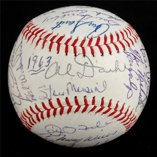 1963 marked the return to the original single game format. It began dominance for the NL that saw them win eight All-Star Games in a row before losing. Eleven more victories followed for the NL. Willie Mays put on a one-man show in the '63 game and grabbed the MVP. Official National League (Giles) baseball is white and Mint. Signatures average 9/10. Roberto Clemente leads the way on a side panel with Sandy Koufax, Don Drysdale, Ken Boyer, Warren Spahn, Hank Aaron, Ron Santo, Duke Snider, Joe Torre, Stan Musial, Willie McCovey and Juan Marichal. Willie Mays and Al Dark are here but their "signatures" are stamped. 30 signatures in total.