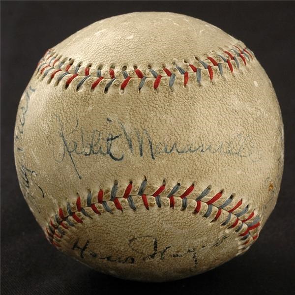 Official Anchor Brand Professional League baseball signed in blue ballpoint by six players in a 1933 game between the Cardinals and the Pirates. Maranville signed on the sweet spot, and teammates Bush and Hoyt signed on the side panels. Accompanying 8 x 11" photo shows Maranville signing this very ball while leaning against the railing. A crowd of mostly young men is in the nearby stands, all very aware that the photo is being taken. After ball was signed on the field, it was taken into the dugout where it was signed on the side panels by Wagner, Blanton and Berger. In VG condition. Overall toning to ball. Portions of several signatures light, but legible and a few light spots. Comes with COA.