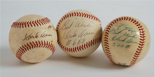 Three baseballs from the all-time Home Run King. A Spalding official NL ball (Giles) signed on the sweet spot, "To Vince", in blue ballpoint. On one panel is "7/14/68 Best Wishes Hank Aaron 500th", signifying that the ball was used in the game that Aaron jacked home run number 500. Signature is a 9/10 and the ball is NRMT. Ball number two is for number 600. It's a Spalding official NL (Feeney) with "1-21-72 Best Wishes Hank Aaron #600." Signature is a 9/10 and the ball is NM-MT. The third ball is another NL (Feeney) and it's in honor of number 700. On the sweet spot is Hank Aaron's signature (9/10) and "#700". Ball is NRMT. For sure, a special grouping of Henry Aaron baseballs. Comes with LOA.