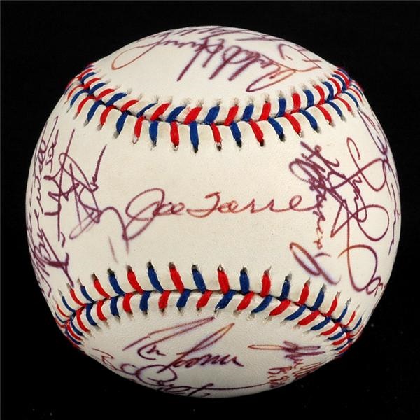 Who could forget the 1999 All-Star Game, with Ted Williams making his grand entrance onto Fenway Park’s playing surface amid the other All-Century candidates situated around the diamond? Then Pedro Martinez’ dominating performance, blowing away five of the six batters he faced. Well, this is a team signed baseball from the American League squad. Official game ball is packed with 36 black ballpoint autographs of the victors: Joe Torre on the sweet spot, with Martinez (MVP), Cal Ripken, Derek Jeter, Nomar Garciaparra, Ken Griffey Jr., Rafael Palmeiro, Jim Thome, Mike Mussina, Roberto Alomar, Bernie Williams, Magglio Ordonez, as well as Cone, Visquel, Lofton, Baines, Green, Wetteland, Rice, et al. One of the tougher All Star baseballs to find from the 1990’s, this example is a beauty, in strong Near Mint to Mint condition all the way.