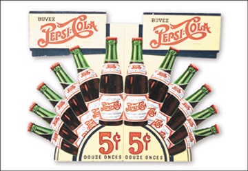 Out of this world full-color cardboard die-cut display stands 16" tall. Folds out to impressive 20" wide. Sports a plethora of Pepsi-Cola bottle with the "early" labels and marks. Would look amazing on a kitchen counter. Came out of Montreal (hence it is in French) with the appropriate "Lithographed in Canada" mark. No longer 5 cents. EX.