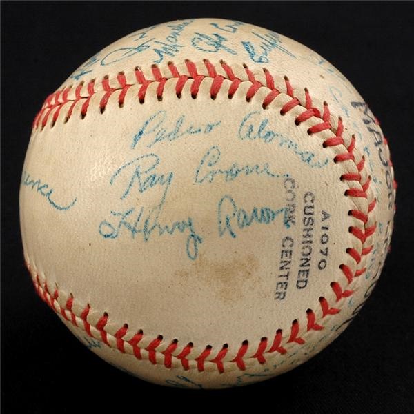 From Hank Aaron's back pages, this team signed baseball is from his 1953-54 stint with the Criollos del Caguas in Puerto Rico before he made it to the majors!!! Caguas won that Caribbean World Series, and this is the earliest known baseball signed by Hank Aaron. Official Puerto Rican League baseball by Wilson with 18 signatures including Mickey Owen. Overall EX-MT with the Aaron, a beauty. His signature is scripted in a simplified, almost childlike scrawl. Has a great "Negro League" feel to it. A most important piece that should not be overlooked. The photo is a bit rough, but is the style only given to players (this to the legendary Vic Power).