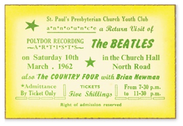 The Beatles were touted as "Polydor Recording Artists" on this return visit to the St. Paul Presbyterian Church Youth Club. This was one of several Beatle's tickets found among the files of the "Seaview Press" printing company. Incidently, a color laser copy of the hand designed graphics for this ticket, originally part of the Seaview files is included! Scalloped, gold leaf border….Superb condition!