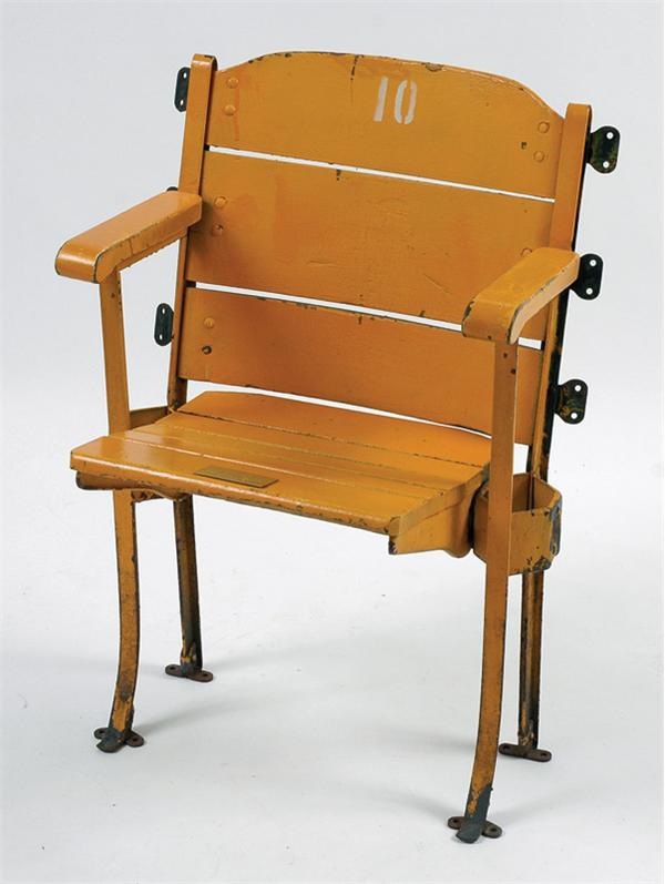 Primo Boston Garden seat here. All-original yellow beauty from this storied arena is a rare one, as it has armrests on both sides. #10 stenciled on top slat in white. Small brass plate affixed to seat bottom which reads "Genuine Artifact From The Boston Garden. Home of the Boston Bruins 1928-1995; Boston Celtics 1946-1995. Authenticity Guaranteed by NBG. Corp. Boston, Ma." The condition is absolutely fantastic. Solid as the day it was put into the North Station building. The gents that sat in this witnessed Shore, Russell, Clapper, Bird, Orr, Cousy, Neely, Havlicek, Bourque and more at their very best. An exceptional example.