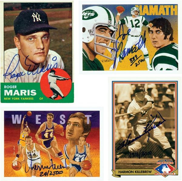 Offered is an astonishing assortment of signed pieces from the top athletes of all four major sports highlighted by the Yankee trio of DiMaggio, Mantle, and Maris. Included are: 1) Two 1992 Score autographed "Joe DiMaggio-The Legend" cards (2037/2500, 2388/2500). 2) Two 1991 Score autographed "Mickey Mantle 7" cards (499/2500, 1589/2500), 1992 Score triple signed card with Mantle, Musial, and Yaz, Mantle signed 8"x10", and Mantle signed hat from his 1991 Loma Linda Charity Golf Classic. 3) 1963 Topps #120 signed by Roger Maris. 4) Two 1990 Nolan Ryan signed Upperdeck cards. 5) Two 1991 Harmon Killebrew signed UD cards. 6) 1991 Bobby Hull signed UD card (1839/2500). 7) 1991 Joe Montana signed UD card (1519/2500) 8) 1991 Joe Namath signed UD card (889/2500). 9) 1991 Jerry West signed UD card (24/2500). Reggie Jackson, Killebrew, Aaron, Ripken, Perry and more. Overall autographs are 8/10 or better on EX-MT-NR-MT cards and items. Also, seven Red Sox signed baseballs: 1) 1988 - Clemens, Boggs, and a bunch of clubhouse signature. 28 in total. EX-MT. 2) 1978 - Red Sox with Rice, Evans. Eck and Tiant. The rest are clubhouse. 24 sigs. EX. 3) 1986 - Clemens, Seaver, Boggs, Buckner, Rice and Baylor. 33 sigs. 4) 1990 - Clemens, Reardon, Boddicker and a couple of clubhouse. Some clubhouse sigs. EX. 5) Red Sox Old-Timers - Williams (NRMT-MT), Doerr, Radatz, Lonborg, Runnels, Malzone, Pesky and Tiant. 16 total.