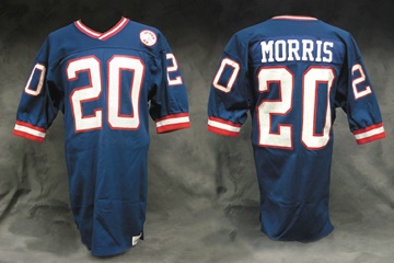Great use on this home gamer from the Championship season. The star running back's number "20" is on front, back and both sleeves. "Morris" across shoulders. Great patch on upper left chest is a tribute to recently deceased Giant legend Spider Lockhart. Tail tagging: "Designed & Tailored Exclusively for the New York Giants, Sand Knit." A treasure from the Meadowlands.