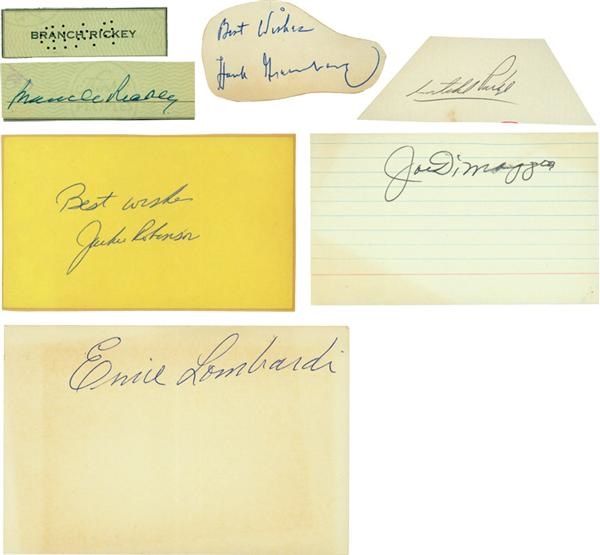 Outstanding collection of 121 autographs of 56 of baseball's great Hall of Famers. Collected over a period of 45 years, highlights include Joe DiMaggio7/10 (because of smudge to "a"), (2) Hank Greenberg 9/10, Jackie Robinson 10/10, Satchell Paige 9/10, Casey Stengel, Ted Williams (cut out around signature), (2) Bob Lemon, (2) Jesse Haines, (2) George Sisler, (4) Rube Marquard, (2) Warren Spahn, (3) Charlie Gehringer 10/10, (4) Ted Lyons, (2) Red Faber, (3) Freddy Lindstrom all 10/10, (4) Luke Appling, (2) Johnny Mize, Nelson Fox, Lefty Gomez 10/10, Zack Wheat, (3) Lou Boudreau, (2) Lloyd Waner 10/10, Wahoo Sam Crawford 10/10, (3)Don Drysdale (2 are 10/10. (4) Ernie Lombardi 10/10 Branch Rickey 10/10 and (4) Cool Papa Bell (4). Most are signed on 3x5 index cards, a few personalized, a few from scrapbooks, or off the backs of Hall of Fame plaque postcards. A great starter collection, with some autographs cut charmingly coarse, such as the trapezoidal Satchell Paige, a balloonish Casey Stengel and Hank Greenberg, and the rectangular, lower right side of a check signed by George Sisler. These legends are all deceased, but forever remembered.