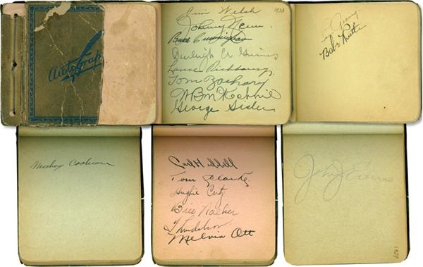 Standard autograph book (4 x 5") containing over 120 signatures from the 1929-1932 era here, including Babe Ruth and Lou Gehrig. Most are in ink; some are in pencil. Here are some of the highlights: John J. Evers alone on a page, in pencil, from 1929; three pages with 25 members of the 1930 Boston Braves in black fountain pen, with McKechnie, Sisler, Maranville and Grimes; six Giants on a page, in black ink, including Hubbell and "Melvin Ott" (10/10, a Killer Sig); Mickey Cochrane alone on a page; 15 members of the 1931 Boston Red Sox on one page in ink; Babe Ruth and Lou Gehrig together on a page, in fountain pen. Ruth is an 8.5/10, and Gehrig is a 7/10. The possibilities are endless of what could be done with this page. All of the autographs were obtained in Boston at the two ballparks. Condition of the book itself is VGEX, with normal handling wear from the seventy-plus years of showing this baby off.