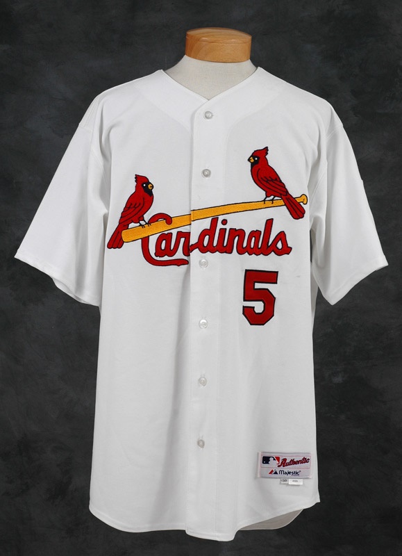 From 2001’s N.L. Rookie of the Year, to 2005’s NLCS Most Valuable Player, Albert Pujols short, amazing trip in the Major Leagues has kept baseball fans in awe, and St. Louis Cardinals fans beholden. After the previous year’s World Series run (losing to the charmed Boston Red Sox), you can’t fault first baseman Pujols’ for not trying to bring his Cardinals back for another October attempt in 2005, especially after his three-run homer in the ninth inning against the Houston Astros in Game Five of the National League Championship. That single hit alone kept the hope alive, and although the Cardinals lost to the Astros in the last game, Pujols brought home the N.L. Series' MVP prize. This awesome St. Louis Cardinals game worn jersey was part of Pujols’ stellar 2005 season. Signed in black sharpie (10/10) by Prince Albert himself on the back under his red and black nameplate, and above his bold, red #5. The button-down front carries the famous St. Louis logo - those beautifully embroidered, yellow-beaked red cardinals balancing on a yellow bat. Tail tagging by Majestic Authentic, size 50, with flag tag “2005”. Left sleeve carries patch celebrating “Busch Stadium, Final Season, 1966-2005”. Light use jersey was given to Arizona Diamondback Javier Vazquez to auction off for a charitable foundation in Puerto Rico.