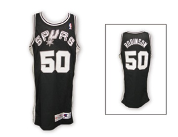He was named one of the N.B.A.'s Fifty Greatest Players of All-Time this year, and when he hung up this well-worn gamer at the close of the season, he headed to Atlanta to lead the Dream Team to Gold. "Spurs 50" crosses chest, with "Robinson 50" on verso. Tagging in tail reads, "Designed & Tailored Exclusively for San Antonio Spurs, Body Length +4, Champion [size] 46." He's a guaranteed Hall of Famer, so shouldn't you get this one in your collection before his stock price goes through the roof?