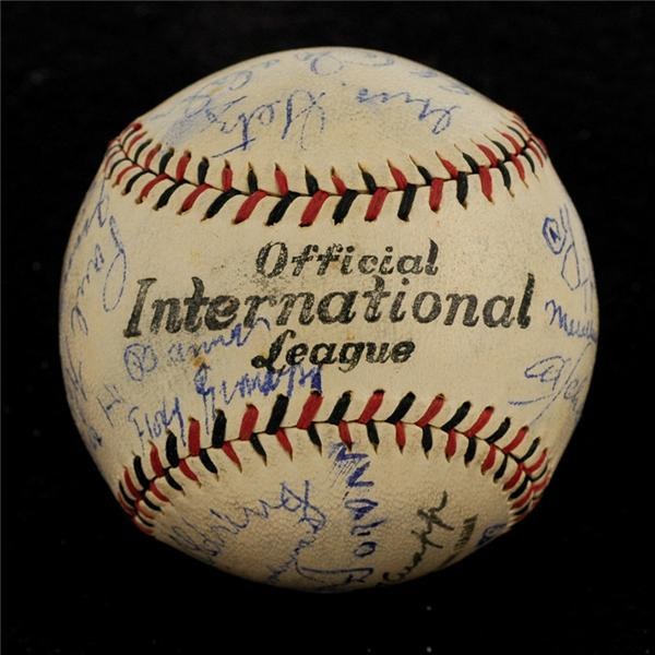20 blue fountain pen signatures on an Official International League baseball from the early 1930's, highlighted by Cy Young, Ed Walsh, Dave Bancroft, Al Schacht, Rube Oldring, Nick Altrock, Ed Rommel, Tim Jordan, Wyatt Lee, Paul Krichell, E.D. Zimmerman, Jimmy Cockman, Gus Getz, Bill Zimmerman and Johnny Enzman. Clear sigs range from 6-9, with most being 7s. The well-scripted example of Young is an 8, Walsh and Bancroft are 7s. Overall Ex-Mt. President of the league Charles H. Knappe's facsimile sig is on a panel as well. Our guess is this is a reunion ball of some kind, with many players’ autographs you never see on an orb.
