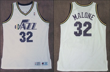 Road white mesh gamer shows good use from the future Hall of Famer. "Jazz 32" decorates chest in purple; "Malone 32" on back. Full tagging in tail reads, "1992-93 Designed & Tailored Exclusively for Utah Jazz, Body Length +4, Champion [size] 50." Just get it signed by the big guy and watch the value soar.