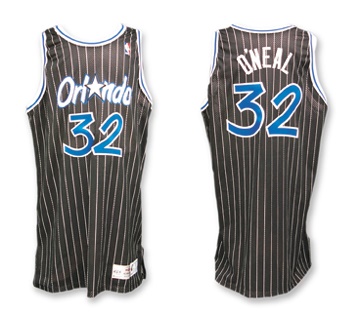 secured his place in history, and likely in the Hall of Fame. So the importance of a Shaq rookie jersey cannot be overstated. Strong, fine wear on this sharp black beauty with "Orlando 32" on the chest and "O'Neal 32" on back. Tail tagging: "Designed & Tailored Exclusively for Orlando Magic, Body Length +4, Champion [size] 54." It shouldn't be too hard to get this one signed, making it perhaps the ultimate collectible from this true giant of the game.
