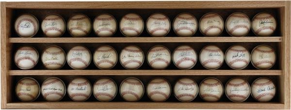 Sweet collection comes with two custom display cases. Some of the bigger and better names (alphabetically) include Aaron, Appling, Ashburn, Averill (badly faded), Barlick, Bell, Berra, Brett, Bench, Carlton, Chandler, Conlan, Cronin (VG), Dandridge, Dickey, DiMaggio, Doby, Drysdale, Ferrell, Ford, Gehringer, Gomez, Grimes, Herman, Hubbell, Hunter, Hoyt (VG), Johnson, Koufax (VG), Killebrew, Leonard, Lopez, Lyons, Mathews, Mize, McCovey, Musial, Reese, Palmer, Rizzuto, Ryan, Seaver, Schmidt, Sewell, Spahn, Stargell, Terry, T. Williams (EX), Wynn, Yount. Cal Ripken and Jim Rice are also included in the group bringing the grand total to 90 baseballs. All are on Official Rawlings balls with the league the player played predominantly in corresponding to the signatures and average condition is EX-MT with many NRMT. Some of those that are EX or less are noted above. Lower grades are attributed mostly to toning of the balls. The majority of these signatures were obtained in person and those that were not were purchased back in the 1980's. A complete list of these balls is available upon request.